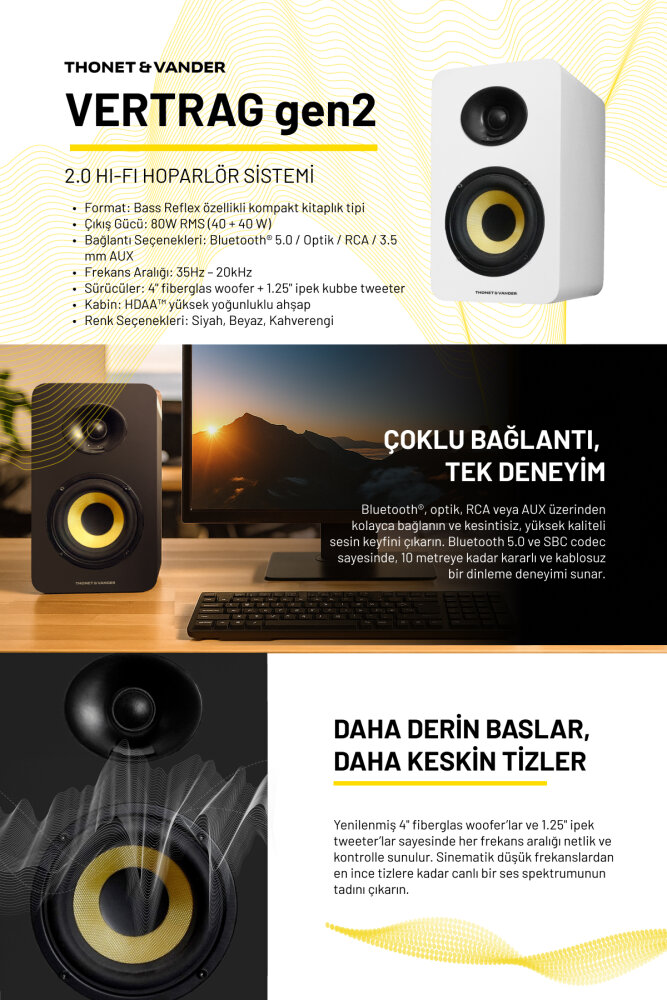 Vertrag Gen2 80W RMS Hoparlör 2.0 Bluetooh 5.0 RCA Optik Beyaz Renk